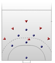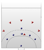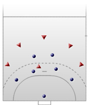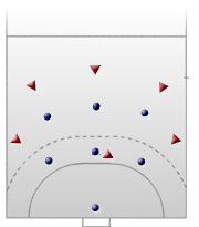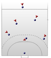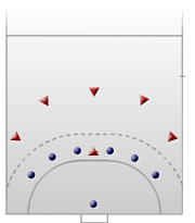 6mライン沿いに全員が並ぶ。 DFの間隔が狭いためフローターは抜き去ることが難しい。 引いて守るぶんロングシュートが撃たれやすく、パス回しも楽にされてしまう。